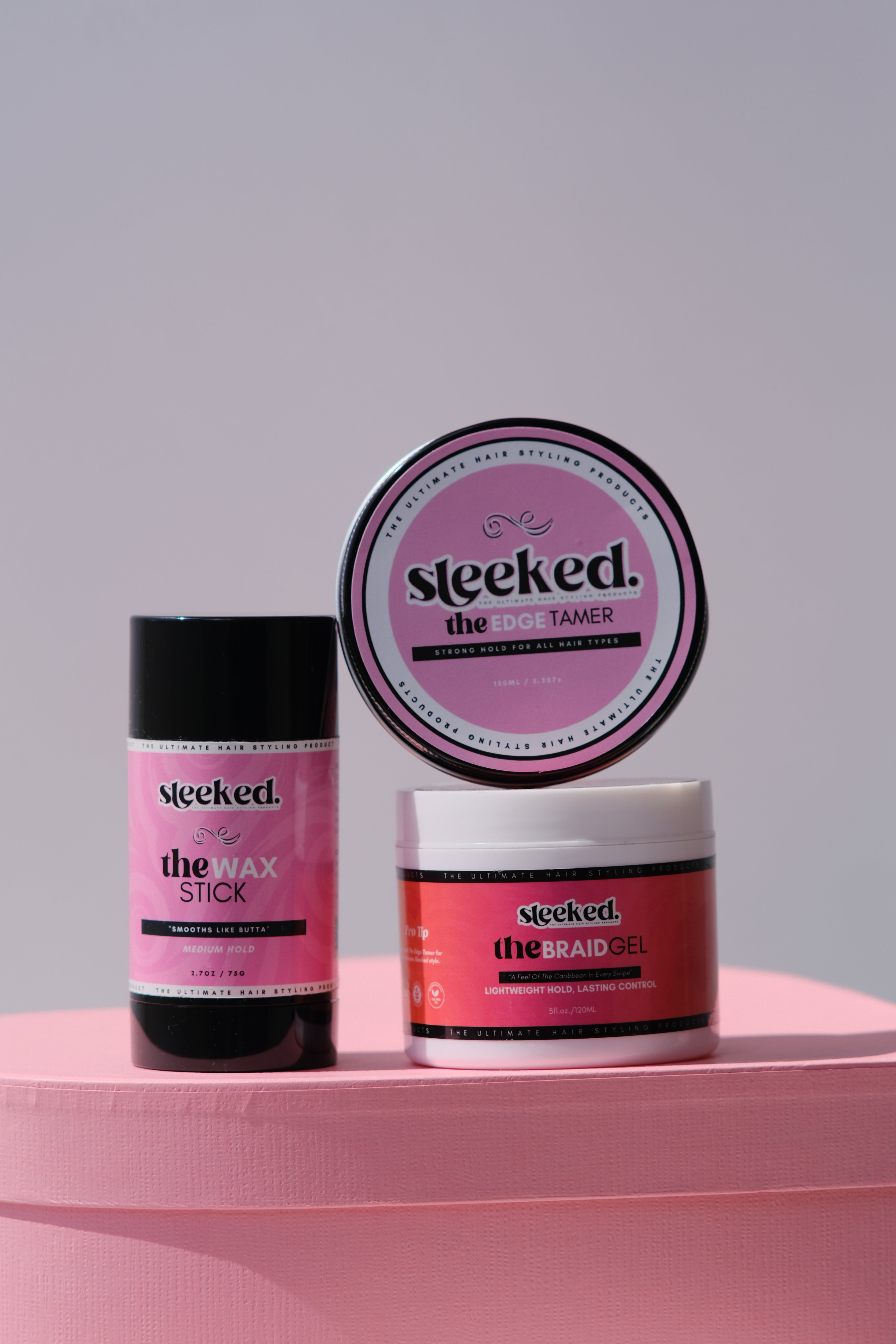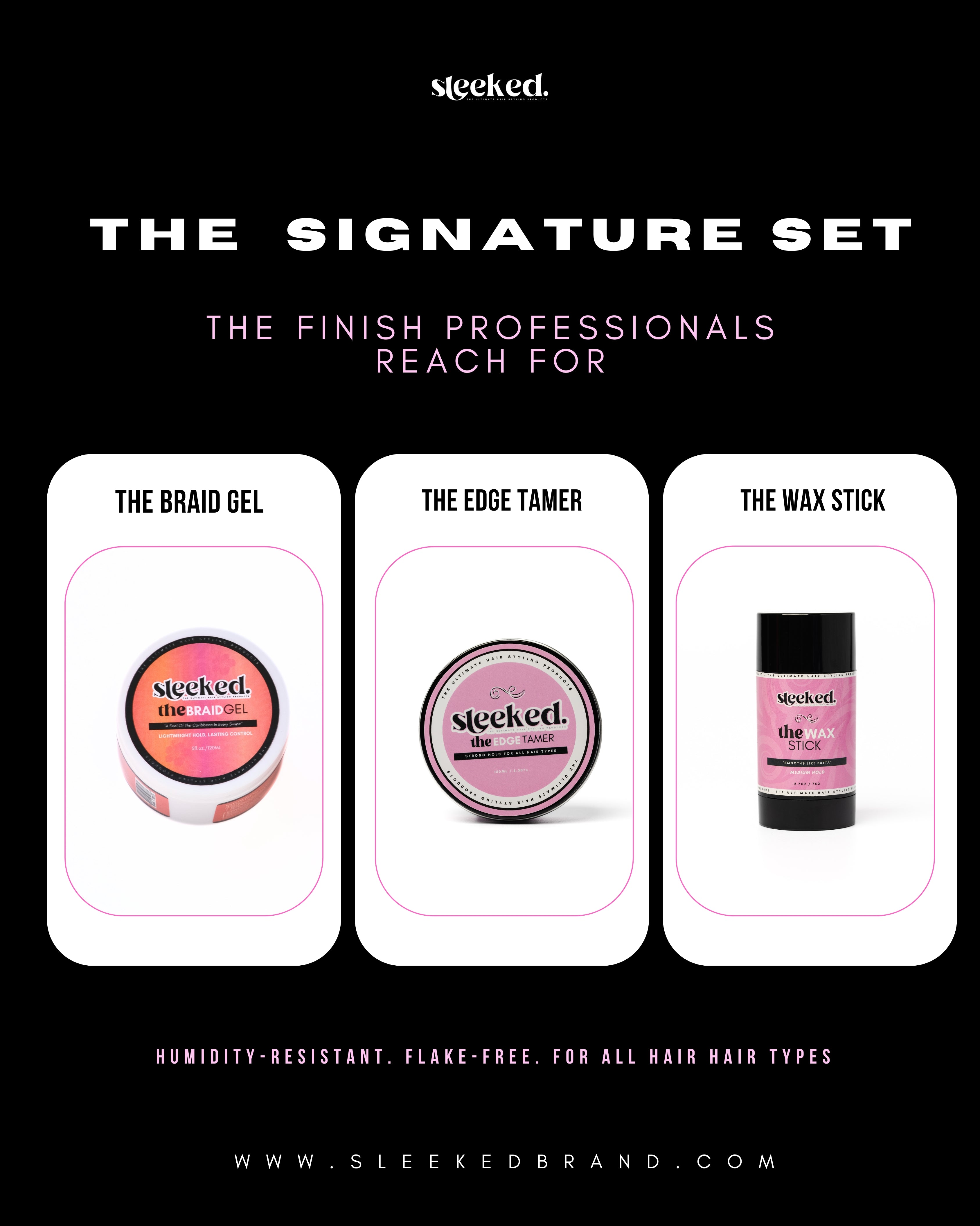 Built for professional finishes. The Signature Set brings together our three Sleeked essentials: The Braid Gel for secure, clean parts and lasting control, The Edge Tamer for 24-hour flake-free hold, and The Wax Stick to smooth flyaways and blend seamlessly. Humidity-resistant. Lightweight. Made for all hair types. Whether you’re a...